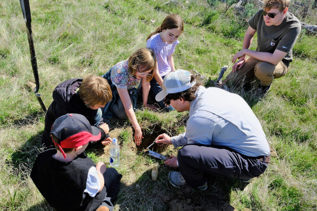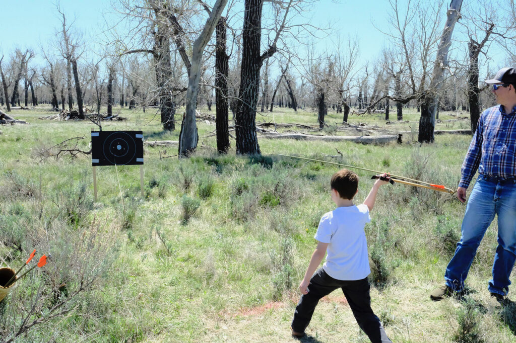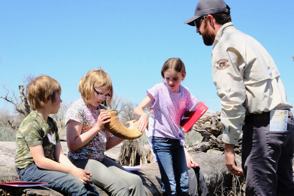 Zach Jensen, Rangeland Management Specialist of the Miles City Natural Resources Conservation Service (NRCS) office, showed the class what arrowheads and various other hunting artifacts one looks for when surveying an area for pipelines and other soil disturbances. He taught them how the use of percussion or pressure was used to create the points.  After discussing how early indigenous hunters created weapons and tools, he taught them how to throw an atlatl! It was surprising how effective the kids were with this weapon. No gatherers here. Nate Reid, partner from American Bird Conservancy, had the students peer through a spotting scope to identify native bird species. He discussed the various adaptations birds undertake to better consume their chosen food source. To demonstrate this concept, he had the students roll to see what ‘beak’ they would end up with, then use it to capture food.
